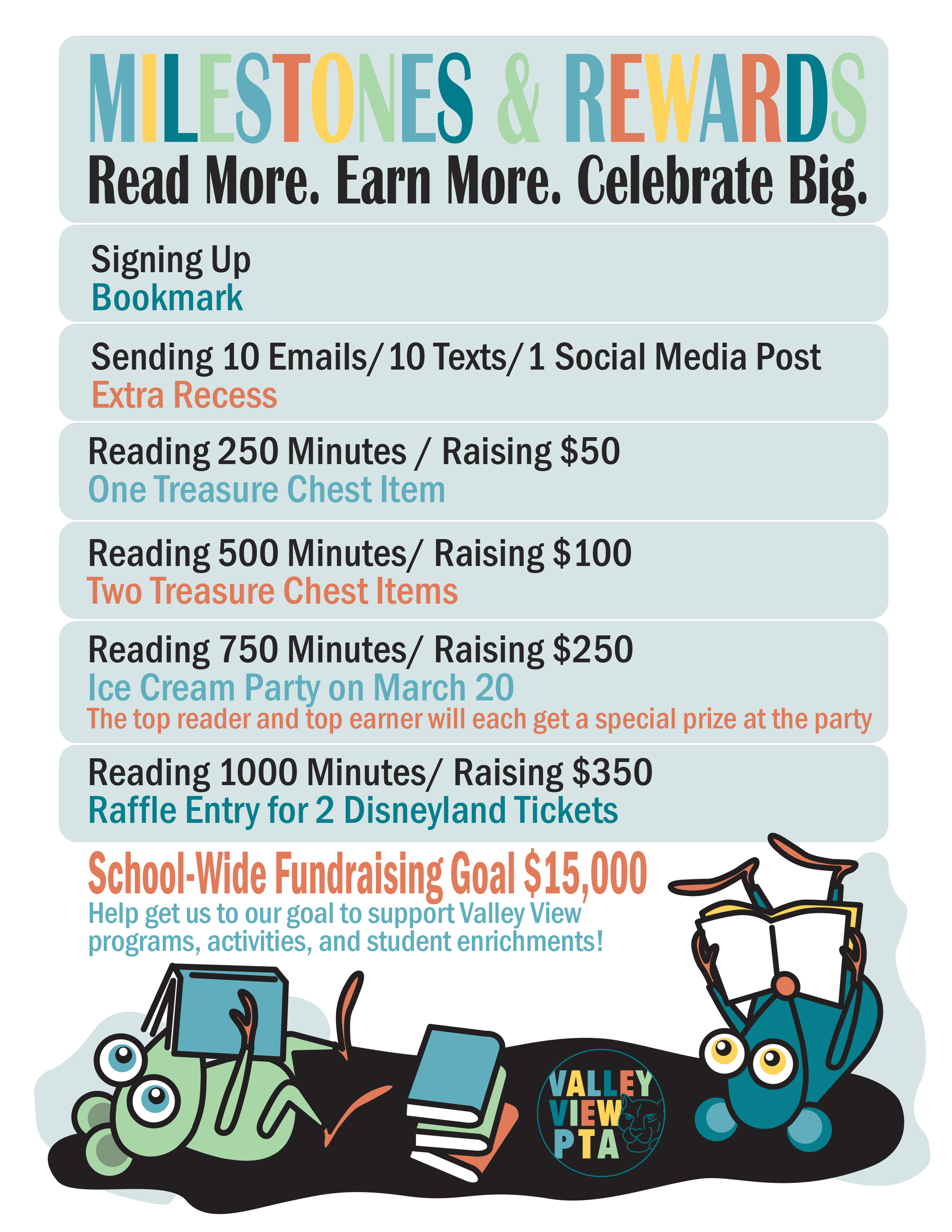 Enroll your student today, and support their literary journey as they raise funds and unlock prizes along the way. Every page read counts towards our fundraising goal and supports the enrichment programs, events, and activities that make Valley View thrive.